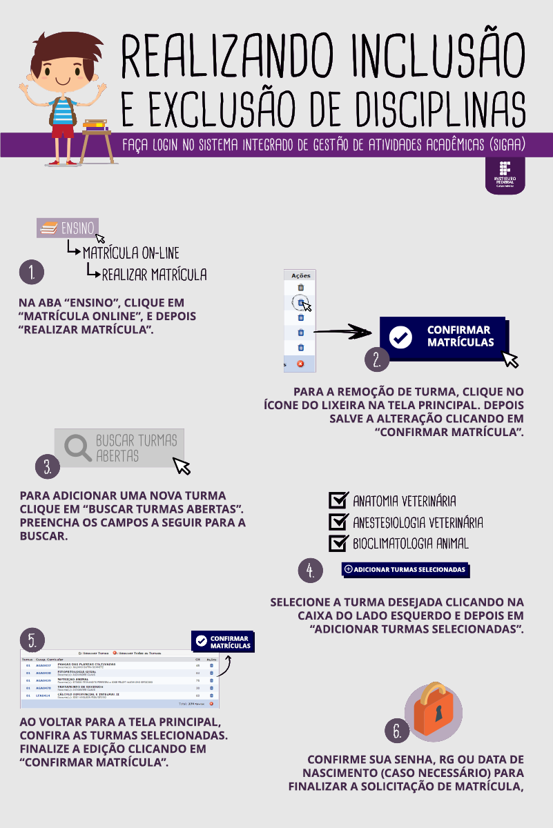 Para auxiliar os estudantes, a instituição disponibiliza tutoriais passo a passo para a realização da matrícula online (PDF) e para inclusão e exclusão de disciplinas (PDF).